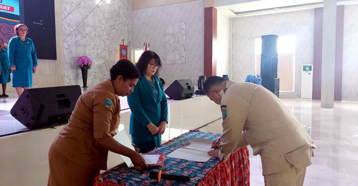 MAYBRAT,– Pj. Bupati Maybrat, Bernhard E. Rondonuwu menghadiri dan melantik Ketua PKK Kabupaten Maybrat, Vonny Rondonuwu dan Pengurus periode 2022-2024, di Gedung Samusiret, Maybrat, Selasa (7/3/2023).