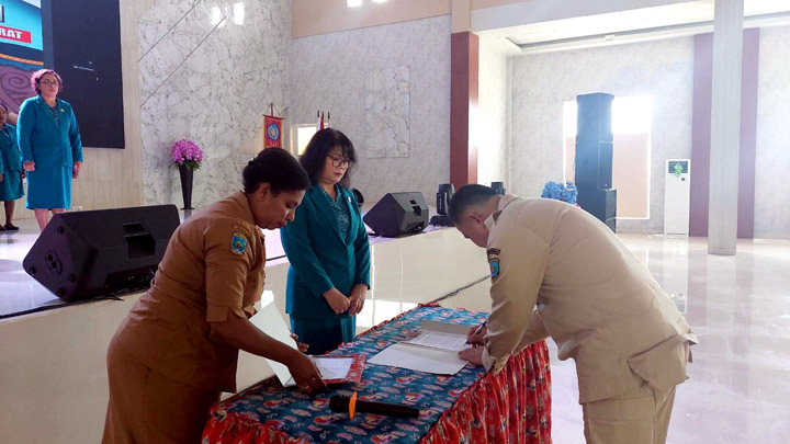 MAYBRAT,– Pj. Bupati Maybrat, Bernhard E. Rondonuwu menghadiri dan melantik Ketua PKK Kabupaten Maybrat, Vonny Rondonuwu dan Pengurus periode 2022-2024, di Gedung Samusiret, Maybrat, Selasa (7/3/2023).