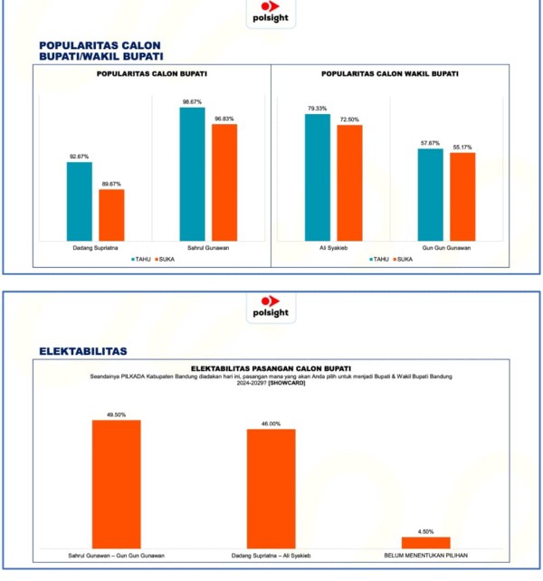 SOREANG, — Lembaga Survei Polsight menempatkan elektabilitas pasangan Sahrul Gunawan-Gun Gun Gunawan masih unggul dibanding pasangan Dadang Supriatna-Ali Syakieb.