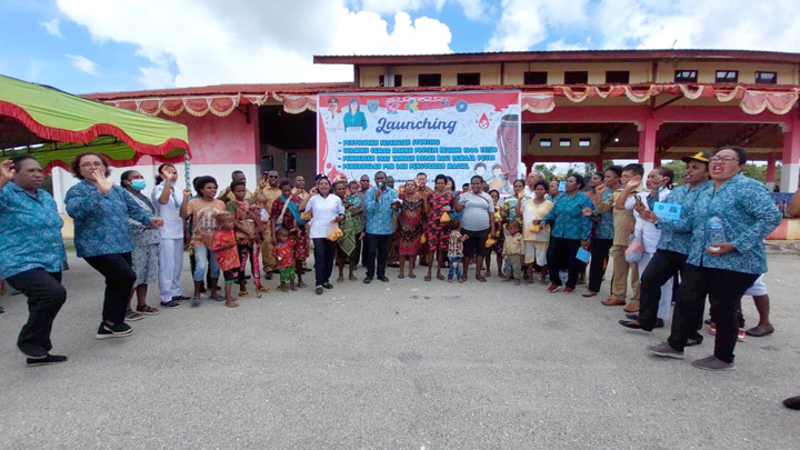 MAYBRAT — Pemda dan PKK Maybrat launching Penyuluhan Kesehatan Stunting, Gerakan Gemar Makan Protein Hewani, Pemberian Obat Tambah Darah, Pemeriksaan PTM dan Pengobatan Massal.