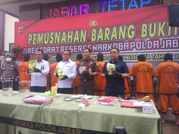 Kabid Humas Polda Jabar Kombes Pol Ibrahim Tompo, S.I.K., M.Si menjelaskan, barang bukti yang di musnahkan berupa Narkotika jenis Sabu sebanyak 4.883,14 gram, Sediaan Farmasi Jenis Jamu 2.577 pcs, Bahan Cream 41 tong, Sediaan Farmasi Jenis Kosmetik 148.500 pcs, Narkotika Jenis Ganja 2.372,09 gram, Obat Keras Tertentu (OKT) 39.092 butir, Tembakau Sintetis 35,8 gram.