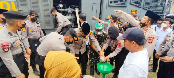 Bantuan pasokan air bersih yang didroping dari Polres Cimahi Polda Jabar pun langsung diserbu ratusan emak-emak pada Kamis (31/8/2022). Menggunakan jerigen dan ember berbagai ukuran, mereka rela antre mendapat giliran mendapatkan air bersih