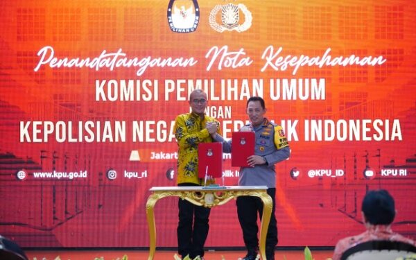 Jakarta – Kepolisian Negara Republik Indonesia (Polri) dan Komisi Pemilihan Umum (KPU RI) menandatangani nota kesepahaman terkait dengan sinergisitas pelaksanaan tugas dan fungsi dalam penyelenggaraan Pemilu dan pemilihan serentak tahun 2024.