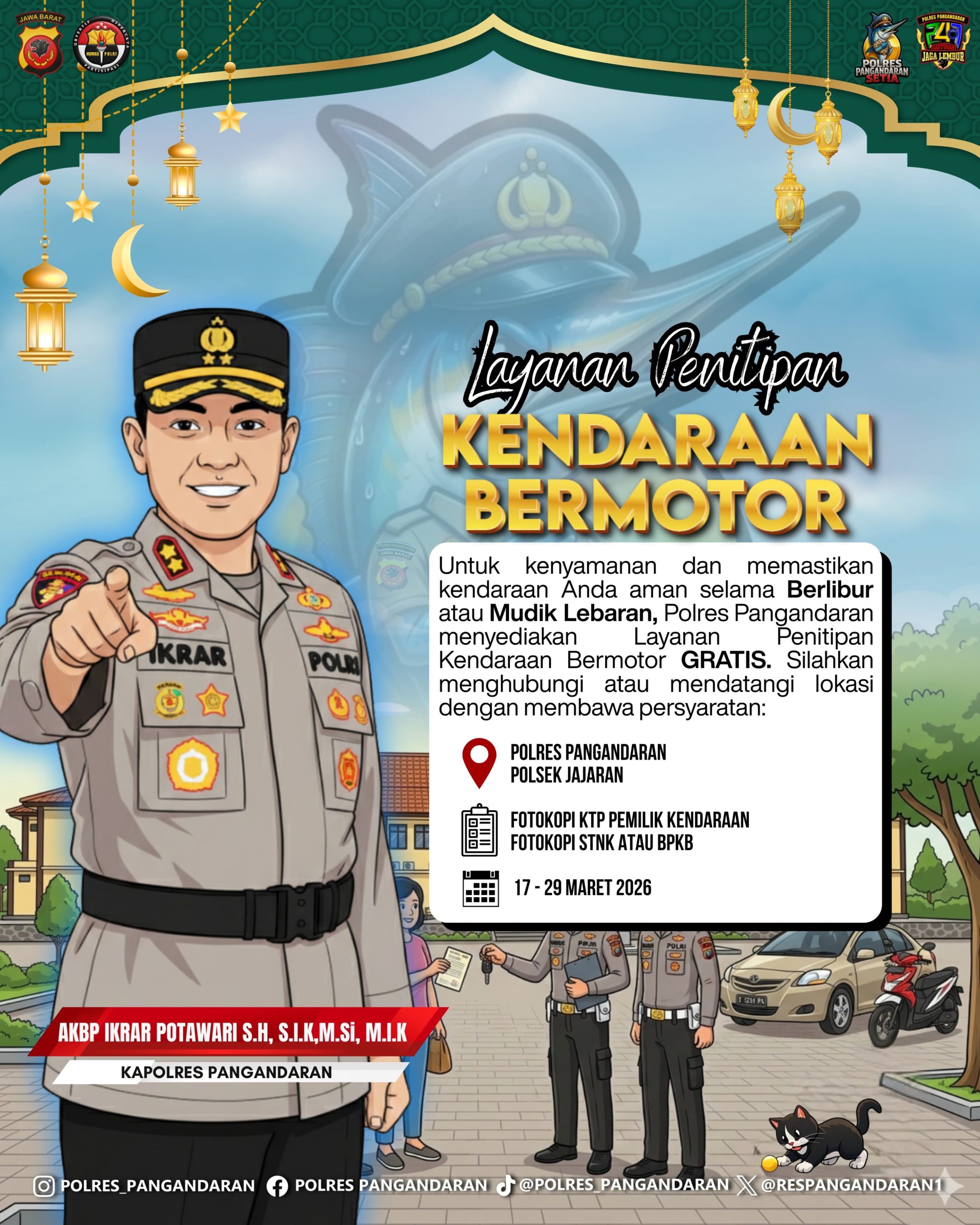 “Kami ingin masyarakat Pangandaran bisa menikmati momen Lebaran dengan tenang. Jangan sampai kegembiraan di kampung halaman terganggu karena memikirkan keamanan kendaraan yang ditinggalkan di rumah. Silakan titipkan kendaraan Anda di Mapolres atau Polsek jajaran terdekat, kami jamin keamanannya tanpa dipungut biaya sepeser pun,” ujar Kapolres