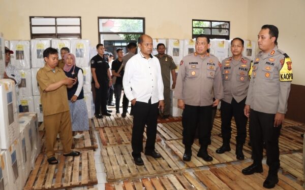Dalam kesempatan tersebut, Kapolres meninjau dan memastikan kotak suara dalam keadaan aman sekaligus memberikan bingkisan kepada petugas yang berjaga di gudang logistik.