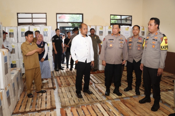 Dalam kesempatan tersebut, Kapolres meninjau dan memastikan kotak suara dalam keadaan aman sekaligus memberikan bingkisan kepada petugas yang berjaga di gudang logistik.