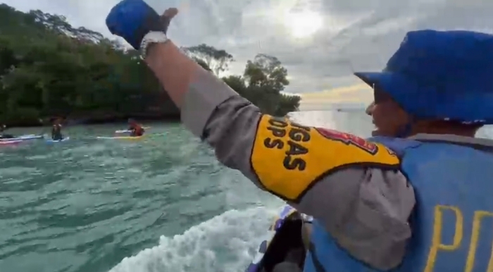“Ini kita lihat bersama, ada wisatawan yang sedang bermain paddle. Ini sebentar lagi jam 5 sore akan kita imbau untuk segera meninggalkan tempat berenang, karena batas waktu berenang adalah sampai pukul 17.00 WIB,” katanya.
