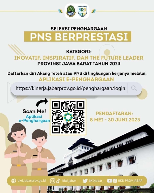 Waktu pendaftaran Seleksi PNS Berprestasi Inovatif, Inspiratif dan The Future Leader Tahun 2023 dibuka sampai 30 Juni 2023 melalui Aplikasi e-Penghargaan dengan alamat website: https://kinerja.jabarprov.go.id/penghargaan. Adapun yang ingin dikonsultasikan lebih lanjut dapat menghubungi Call Center Penghargaan BKD Jabar: 0852-2282-6914 atau 0812-1173-1279. **