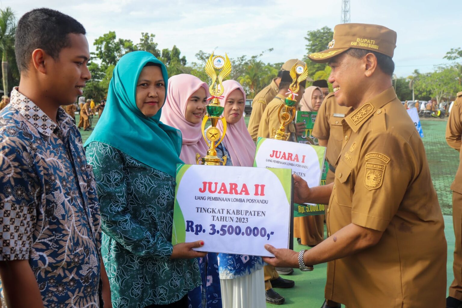 Bertempat di Halaman Kantor Bupati di Gunung Tinggi, Batulicin, Senin (5/6/2023) Bupati Tanah Bumbu H.M. Zairullah Azhar didampingi Sekretaris Daerah (Sekda) H. Ambo Sakka, dan Kepala Dinas Pemberdayaan Masyarakat dan Desa (DPMD) Samsir, menyerahkan hadiah kepada masing-masing pemenang lomba posyandu dan kader posyandu tahun 2023.