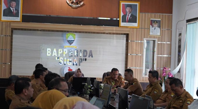 Guna mengevaluasi PSN yang sedang dijalankan di Kabupaten Sumedang, Sekretaris Daerah Kabupaten Sumedang Tuti Ruswati memimpin Rapat Percepatan Laporan Program Strategis Nasional, di Badan Perencanaan Pembangunan Riset dan Inovasi Daerah (Bapperida), Senin (9/3/2026).
