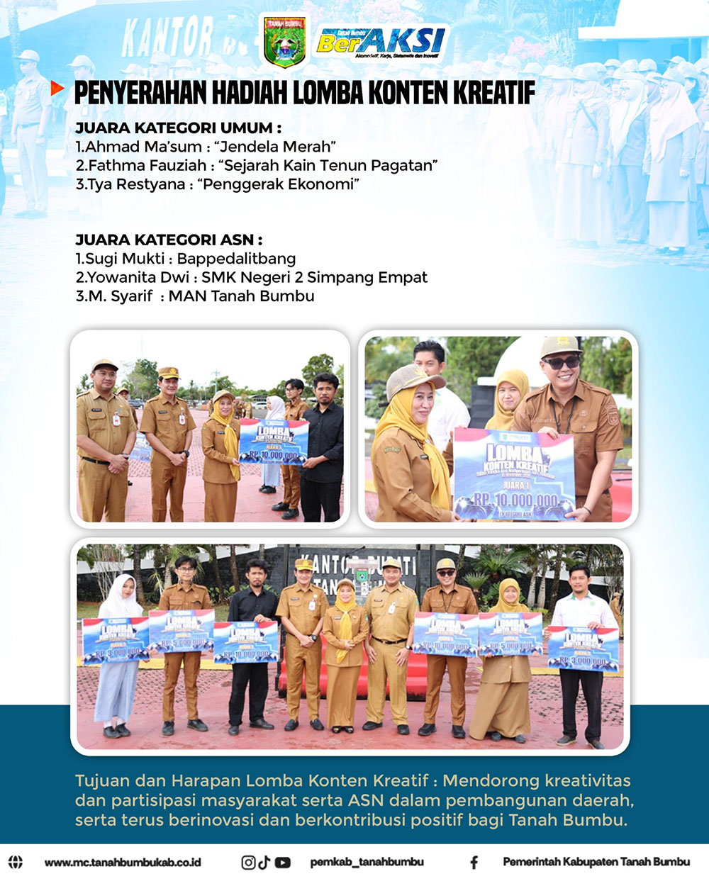 Sementara itu, Lomba Konten Kreatif ini menjadi bagian dari upaya pemerintah daerah dalam mendorong kreativitas dan partisipasi masyarakat.