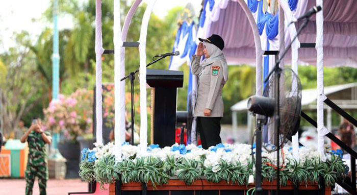 Bupati Tanah Bumbu, H. Andi Rudi Latif, A.Md.T., S.H., M.M., melalui Sekretaris Daerah (Sekda) Tanbu, Yulian Herawati bertindak sebagai inspektur apel.