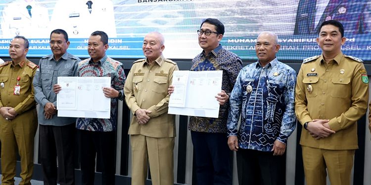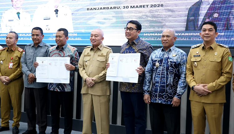 TANAH BUMBU, – Bupati Tanah Bumbu, H. Andi Rudi Latif, A.Md.T., S.H., M.M.,  menghadiri sekaligus menyaksikan penandatanganan kontrak pembangunan Jembatan Pulau Laut yang menghubungkan Kabupaten Tanah Bumbu dan Kabupaten Kotabaru, di Banjarbaru, Senin (30/03/2026).