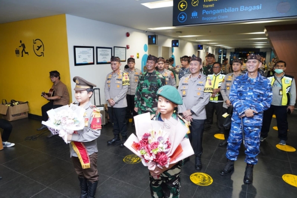 Penyambutan Arus Balik Penumpang Pesawat oleh TNI Polri