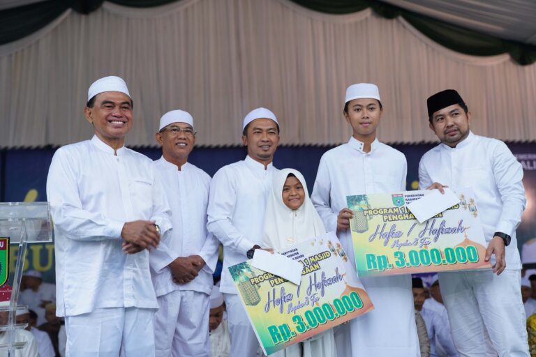Kemudian penyerahan secara simbolis berupa uang pembinaan penghargaan program satu desa satu masjid hafiz dan hafizah hafalan 3 juz diberikan kepada M Setiawan Jodie dari Desa Gusunge Kecamatan Kusan Hilir, dan Hayatul Aulia dari Desa Persiapan Bintang Makmur Kecamatan Karang Bintang.