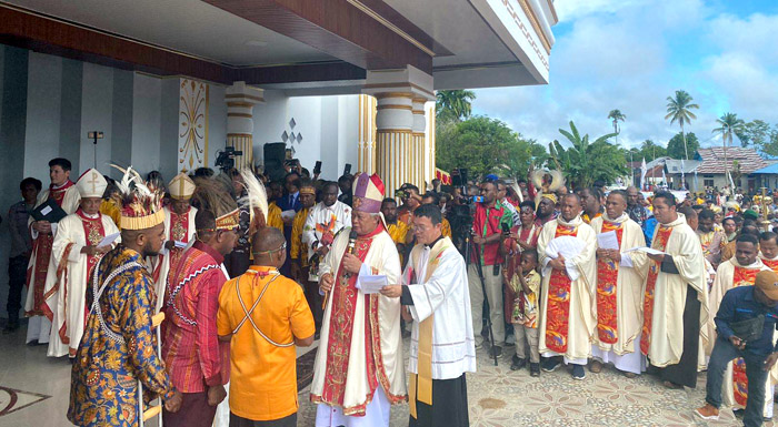 Sesampainya di depan gereja, para rombongan mengikuti acara simbolis penyerahan kunci kepada Uskup Manokwari-Sorong, Mgr. Hilarion Datus Lega, Pr.