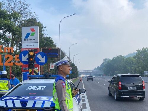 Selama pemantauan terlihat lalulintas pada sore menjelang malam hari cukup ramai, anggota Sat Lantas Polres Cimahi disiagakan guna melakukan pemantauan dan pengaturan terhadap Prioritas pengguna jalan di sekitaran rest Area Km 125 tol cipularang arah jakarta, Minggu (21/5/2023).