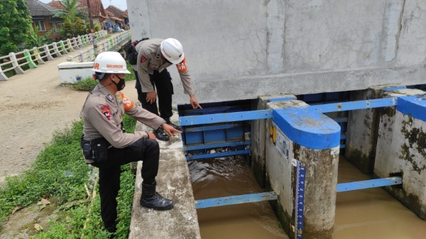 Cirebon,-Anggota Kompi 4 Batalyon C Pelopor Satbrimob Polda Jabar Dpp Aipda Dayat Sudrajat melaksanakan giat pengecekan debit air di pintu air desa Winong kecamatan Gempol Kabupaten Cirebon antisipasi Banjir di wilayah Desa Winong.