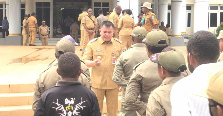 MAYBRAT,– Pj. Bupati Maybrat, Dr. Bernhard E. Rondonuwu, S.Sos, M.Si melakukan penegasan pelaksanan tugas jajaran Satpol PP di Kabupaten Maybrat yang disampaikan di halaman kantor Bupati Maybrat, Senin (16/5/2023).