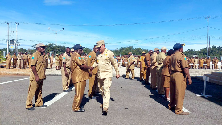 MAYBRAT,– Pj. Bupati Maybrat Dr. Bernhard E. Rondonuwu, S. Sos. M. Si., memimpin apel pagi bersama Aparatur Sipil Negara (ASN) Kabupaten Maybrat, Senin (27/3/2023).