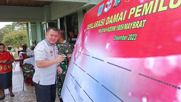 MAYBRAT,– Penjabat (Pj.) Bupati Maybrat, Dr. Bernhard E. Rondonuwu menghadiri Deklarasi Damai pemilu 2024 wilayah Kodim 1809/Maybrat, Jumat (8/12/2023).