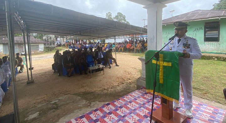 MAYBRAT,– Pj. Bupati Maybrat, Bernhard E. Rondonuwu mengikuti upacara pemakaman Kepala Distrik Aitinyo Utara, Abner Asmuruf, SE, bersama dengan semua Kepala Distrik di Kabupaten Maybrat dan 12 kepala kampung di Aitinyo Utara, serta pejabat struktural Pemkab Maybrat, Selasa (4/7/2023).