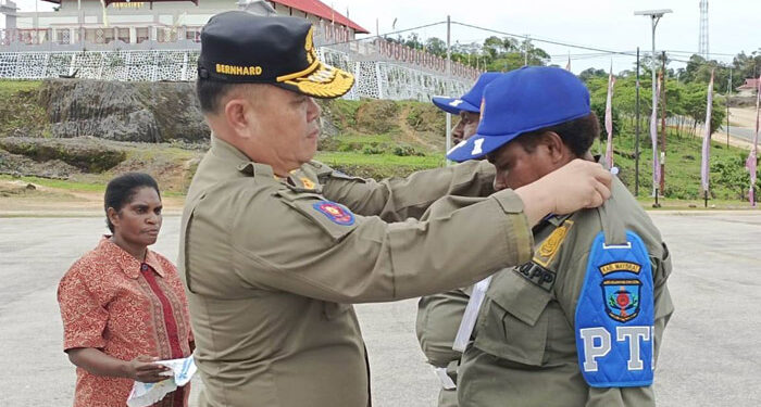 Bernhard langsung memberikan tanda peserta latihan kepada perwakilan Satuan Polisi Pamong Praja Kabupaten Maybrat yang siap mengikuti rangkaian kegiatan latihan.