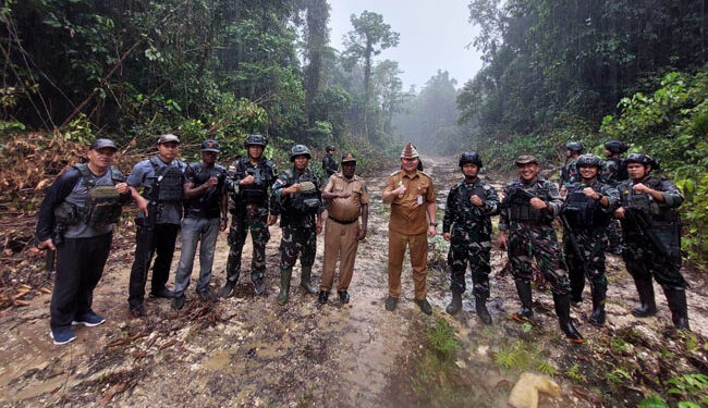 MAYBRAT,– Dalam kondisi cuaca yang kurang mendukung karena hujan, Pj. Bupati Maybrat, Bernhard E. Rondonuwu bersama Dandim 1809/Maybrat, Dansatgas Yonif 133/YS dan personel pengamanan berinisiatif meninjau progres pengerjaan infrastruktur jalan dan jembatan yang menuju Kampung Aisa, Distrik Aifat Timur, Senin (12/2/2024).