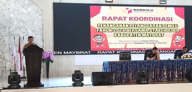MAYBRAT,– Pj. Bupati Maybrat, Dr. Bernhard E. Rondonuwu, S.Sos., M.Si., menghadiri Rapat Koordinasi Penaganan Pelanggaran Pemilu Tahun 2024 bersama Stakeholder Kabupaten Maybrat, di Aula Samusiret Kumurkek, Selasa (16/5/2023).