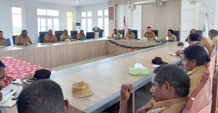 MAYBRAT,– Penjabat (Pj) Bupati Maybrat, Bernhard E. Rondonuwu melakukan rapat bersama 24 kepala distrik, di kantor Bupati Maybrat, Distrik Kumurkek, Maybrat, Papua Barat Daya, Selasa (31/2/2023).
