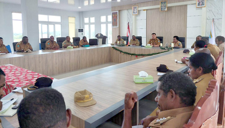 MAYBRAT,– Penjabat (Pj) Bupati Maybrat, Bernhard E. Rondonuwu melakukan rapat bersama 24 kepala distrik, di kantor Bupati Maybrat, Distrik Kumurkek, Maybrat, Papua Barat Daya, Selasa (31/2/2023).