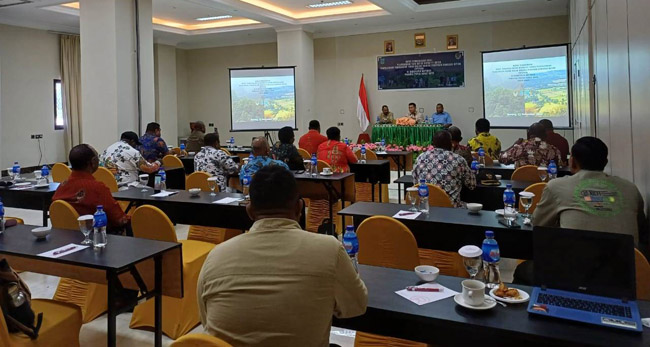 MAYBRAT,– Pj. Bupati Maybrat, Bernhard memimpin rapat pembahasan hasil pelaksanaan tata batas definitif untuk penyelesaian penguasaan tanah dalam rangka penataan kawasan hutan (PPTPHK) di Kabupaten Maybrat, Provinsi Papua Barat Daya, Kamis (23/11/2023).