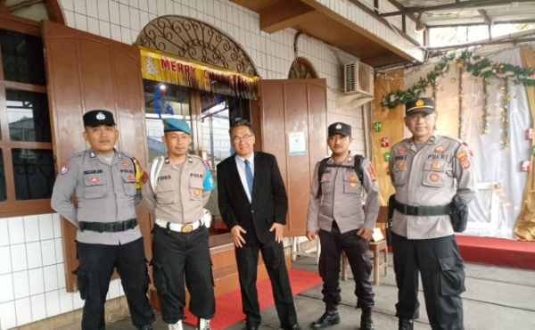 Kuningan,-Tiga Pilar keamanan Kecamatan Cigugur, yang terdiri dari Polsek Cigugur jajaran Polres Kuningan Polda Jabar bersama Koramil serta Pol PP melaksanakan pengamanan kegaitan perayaan Natal di Gereja Batak Protestan, kabupaten Kuningan Jawa Barat, Minggu (25/12/2022).