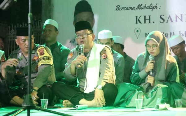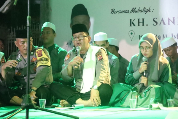 Kegiatan terobosan Polisi religi yang digagas Kapolres Cirebon Kota Polda Jabar melaksanakan lantunan sholawat dalam rangka Hari Santri dan Maulud Nabi di Halaman Musholla Al Istiqomah Desa Sutawinangun Kec. Kedawung Kab. Cirebon, Minggu (23/10/2022).