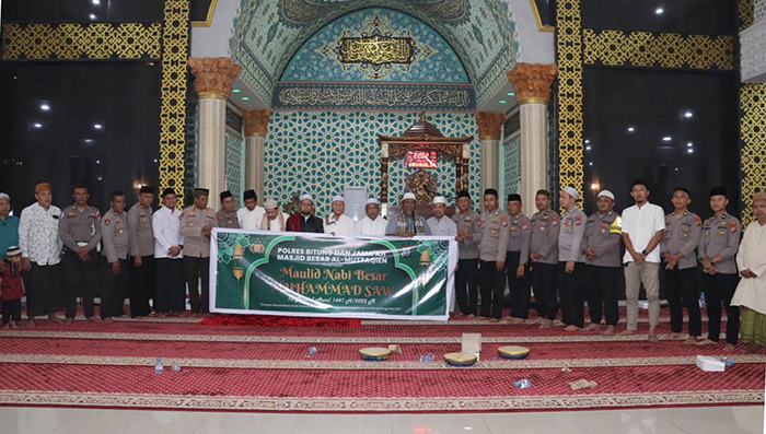 BITUNG, — Polres Bitung bersama Jamaah Masjid Al Muttaqien Girian Kota Bitung, menggelar peringatan Maulid Nabi Muhammad SAW 1447 H/2025 M dengan tema “Dengan Meneladani Ahlak Rasulullah SAW, Kita Wujudkan POLRI Presisi Guna Mendukung Asta Cita”.