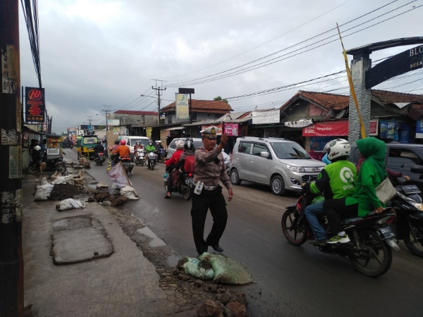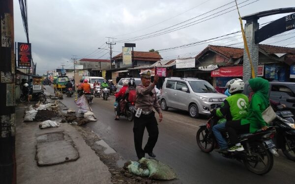 Anggota Unit lalu lintas Polsek Batujajar AKP Tarmubi Antensi melaksanakan pemantauan lalulintas di Depan mako dan di Pos Gatur Cangkorah, Graha Kencana pada Jumat (28/4/2023) dimulai pukul 06.30 WIB.