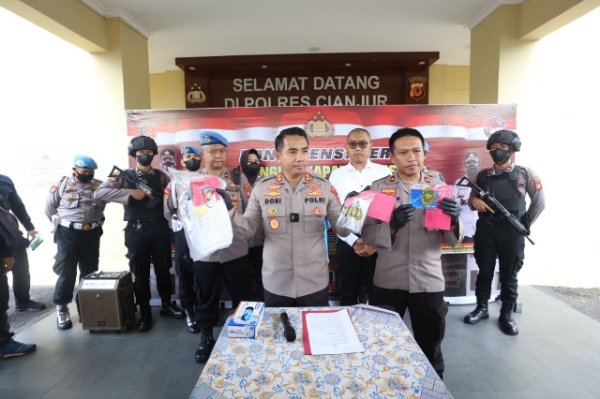 Cianjur,-Polres Cianjur Polda Jabar melaksanakan konferensi pers pengungkapan kasus yang berhasil diungkap oleh personel jajaran Polsek Pacet Polres Cianjur Polda Jabar atas perkara penipuan atau penggelapan berupa arisan online bodong di Mapolres Cianjur Polda Jabar, Kamis (20/10/2022).