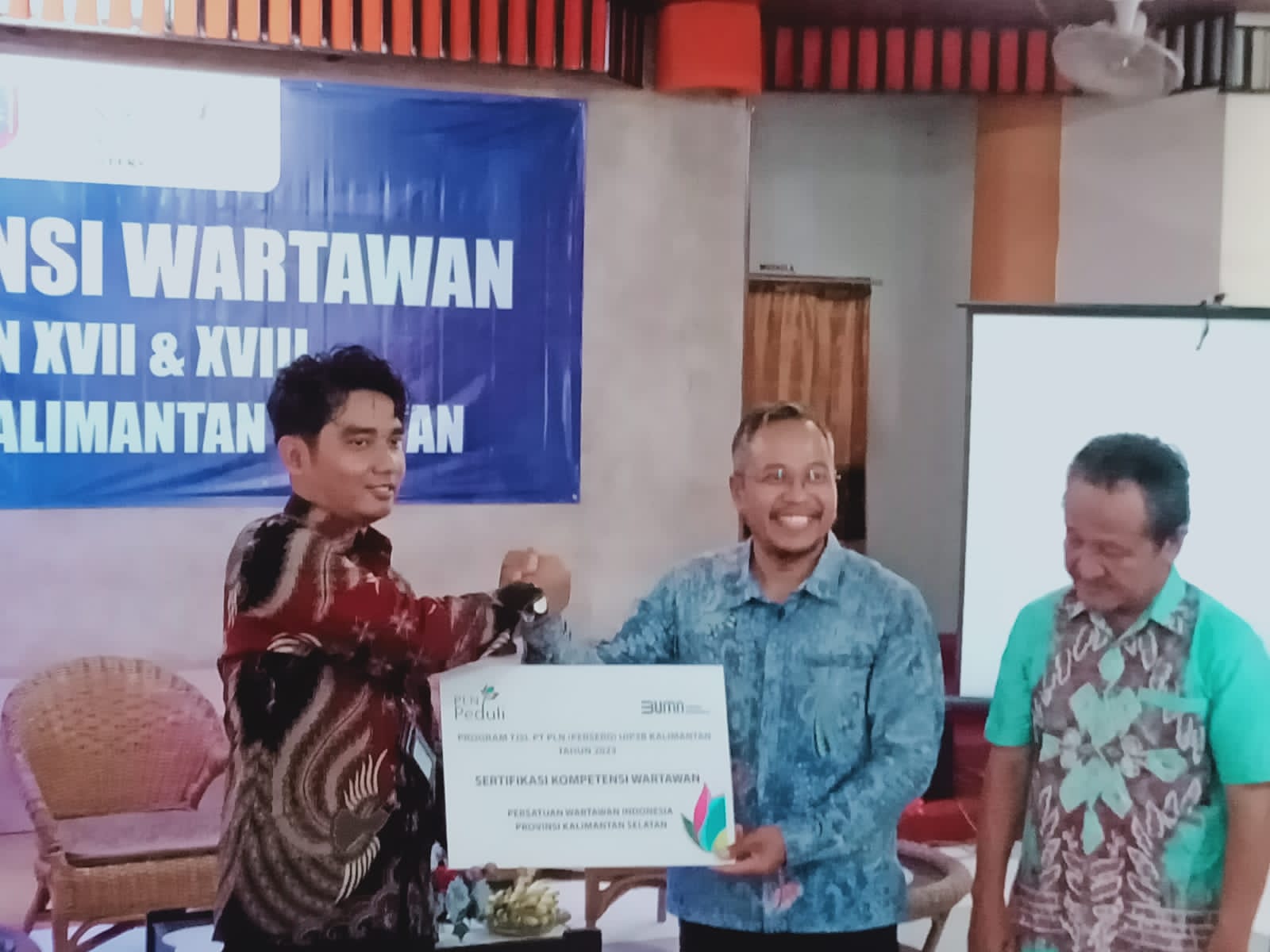 Kerja sama uji Kompetensi Wartawan (UKW) XVII dan XVIII dengan pihak Persatuan Wartawan Indonesia (PWI) Prov.Kalsel disampaikan secara simbolis Manager Komunikasi TJSLPLN UIP3B Sulistya Aji Wibowo,kepada Sekretaris PWI Kalsel Toto Fachrudin,Jumat 26/5/2023, diusai acara Halal Bihalal dan Pra UKW XVII dan XVIII PWI Prov.Kalsel.