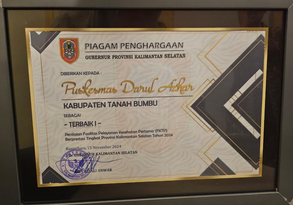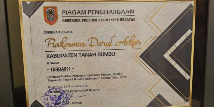Tanah Bumbu — Puskesmas Darul Azhar mengharumkan nama Kabupaten Tanah Bumbu (Tanbu) di tingkat Provinsi Kalimantan Selatan. Pasalnya, Puskesmas yang di pimpin dr Rizky Tri Agustin tersebut berhasil meraih penghargaan terbaik 1 (satu) penilaian Fasilitas Pelayanan Kesehatan Pertama (FPKP) tingkat Provinsi Kalimantan Selatan Tahun 2024.