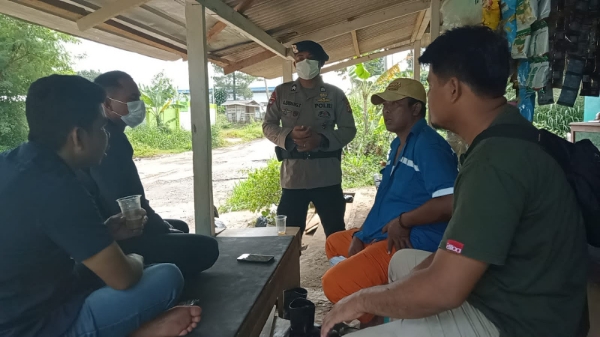 Briptu Agus menyempatkan diri untuk mengajak warga desa yang sedang duduk santai di warung kopi berdialogis untuk tetap terapkan protokol kesehatan dimasa pandemi Covid-19 ini.