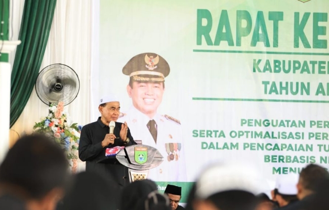 Agenda rapat kerja meliputi pemaparan hasil evaluasi kinerja pembangunan daerah, pemaparan evaluasi reformasi birokrasi, dan program Satu Desa Satu Masjid.