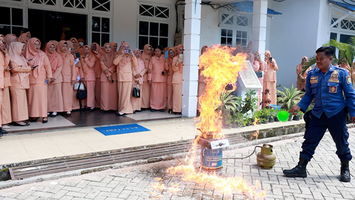 Selain penyampaian materi, kegiatan juga diisi dengan praktik langsung pemadaman api skala kecil, seperti cara menangani kebocoran gas LPG dan teknik mengurangi kepanikan saat menghadapi api di dapur.