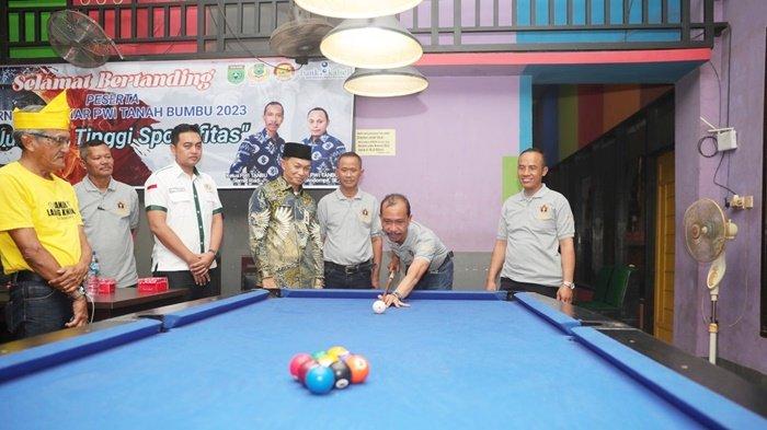 Tanah Bumbu — Pernyataan Sekda Tanbu H Ambo Sakka dan pemukulan bola pertama oleh Ketua PWI Kabupaten Tanah Bumbu Slamet Riadi menjadi penanda dibukanya Turnamen Biliar PWI Tanbu 2023, Kamis (10/8/2923).