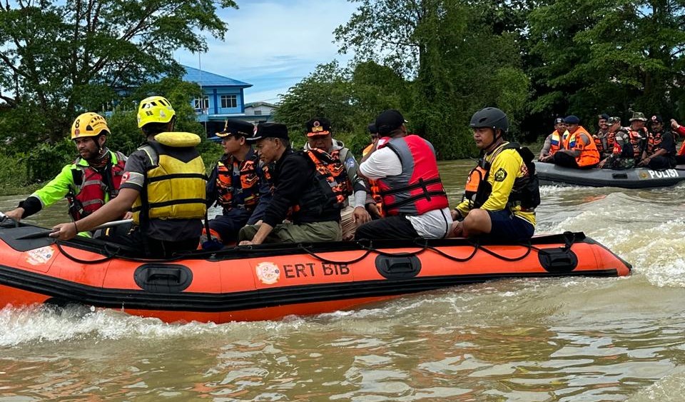 Tampak, Sekda mengenakan pakaian hitam, naik perahu di dampingi Kepala Pelaksana (Kalak) BPBD Tanbu Sulhadi dan rombongan.