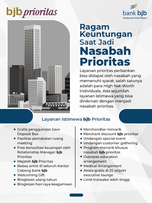 Salah satu bank yang memiliki layanan nasabah prioritas di Jawa Barat adalah bank bjb. Layanan prima milik salah satu Bank Pembangunan Daerah (BPD) terbesar di Indonesia ini menawarkan beragam keuntungan bagi nasabah prioritas mereka.