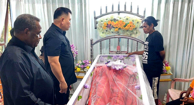 SORONG,– Pj Wali Kota Sorong Dr. Bernhard Eduard Rondonuwu, S.Sos., memberikan penghormatan terakhir kepada Pnt. Paulus Salossa, S.Pd, di rumah duka keluarga Salossa di Kampung Worot, Klademak, Minggu (22/9).