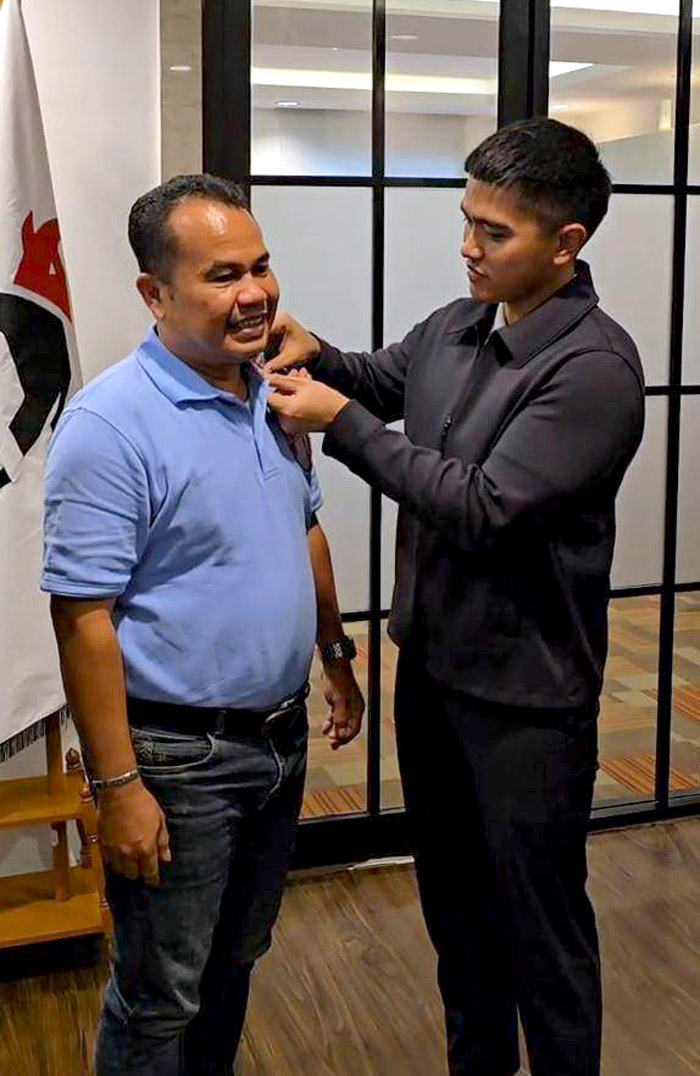 Penyematan pin oleh Ketua Umum PSI Kaesang Pangarep kepada Sekjend DPP BaraJP Boy Nababan. (Foto: Istimewa)
