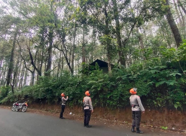 Tim SAR Kompi 1 Batalyon B Pelopor Satuan Brimob Polda Jabar bertindak cepat turun tangan untuk mengecek di lokasi yang di sinyalir rawan dengan tumbangnya pohon tersebut mencegah terjadinya korban tertimpa pohon tumbang
