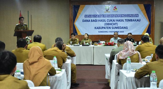 SUMEDANG,– Dalam upaya mengoptimalkan penggunaan Dana Bagi Hasil Cukai Hasil Tembakau (DBHCHT) yang efektif, efisien, dan tepat sasaran, Pemerintah Daerah Kabupaten Sumedang menggelar Sosialisasi Kebijakan Penggunaan DBHCHT Kabupaten Sumedang Tahun 2025 yang dibuka secara langsung oleh Wakil Bupati Sumedang M. Fajar Aldila bertempat di Hotel Hanjuang Hegar, Selasa (4/11/2025).