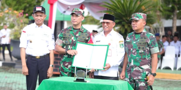 Tanah Bumbu — Wakil Bupati Tanah Bumbu (Wabup Tanbu) Muh Rusli menjadi Inspektur Upacara pada pembukaan TNI Manunggal Membangun Desa (TMMD) ke-120 di Kabupaten Tanah Bumbu. Rabu, 8 Mei 2024, di Halaman Kantor Bupati di Batulicin.